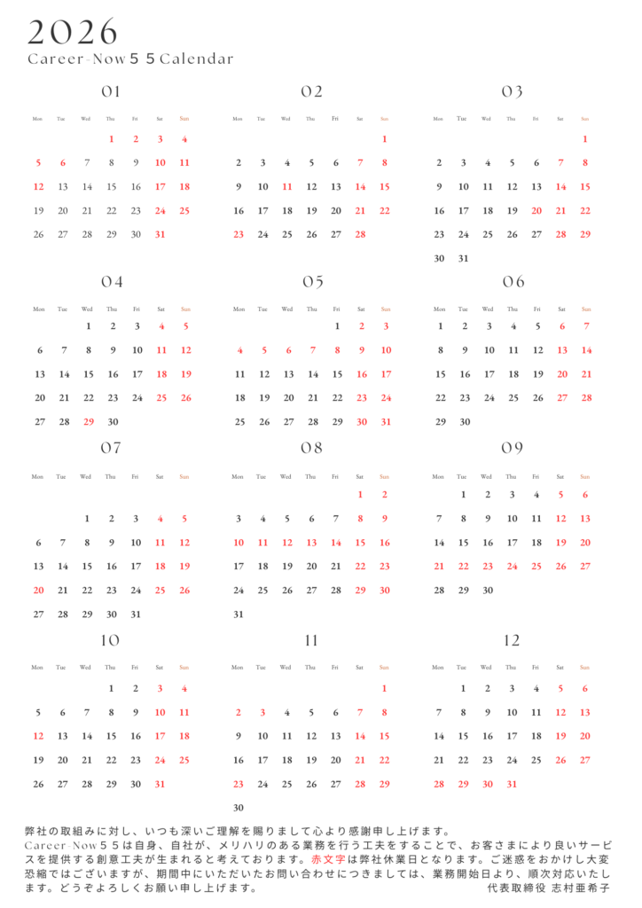 2026年 Career-Now55 カレンダー 投稿者:career-now 投稿公開日:2025年12月26日 投稿カテゴリー:お知らせ 弊社の取組みに対し、いつも深いご理解を賜りまして心より感謝申し上げます。 Career-Now55は自身、自社が、メリハリのある業務を行う工夫をすることで、お客さまにより良いサービスを提供する創意工夫が生まれると考えております。赤文字は弊社休業日となります。ご迷惑をおかけし大変恐縮ではございますが、期間中にいただいたお問い合わせにつきましては、業務開始日より、順次対応いたします。どうぞよろしくお願い申し上げます。 代表取締役 志村亜希子 おすすめ 「ベトナム人 技能実習生向けCN55式研修トライアル」受注開始しました。 2025年8月8日 パートナーシップ契約を締結 2025年7月10日 1分でわかる コミュニケーションの原理 2025年12月22日