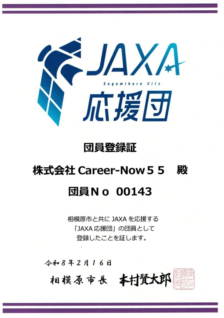 株式会社 Career-Now55は、JAXA宇宙科学研究所(以下「宇宙研」という。)を応援する意欲のある企業として相模原市より団員登録していただきました。